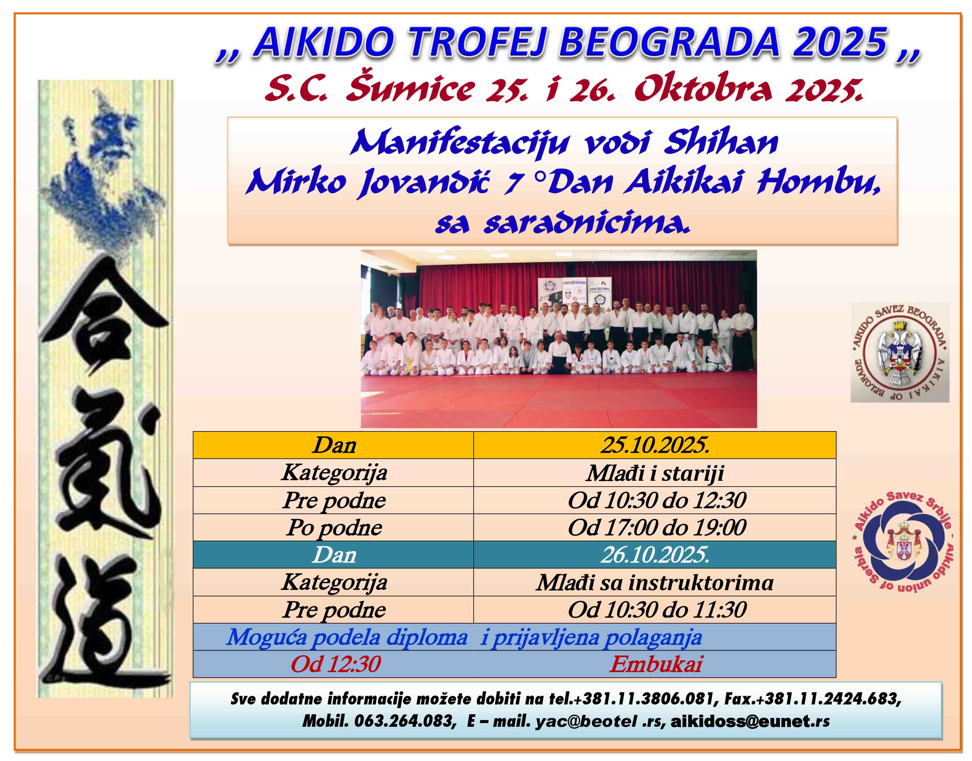 Dvadeseta za redom manifestacija "Aikido Trofej Beograda – 2021." održaće se u voždovačkom SC Šumice 23 i 24. Oktobra 2021.godine. Molimo vas da angažujte mlađe kategorije jer one su budućnost aikidoa. Vidimo se.